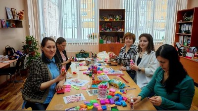 Снять напряжение и усталость от кропотливого ручного труда помогли музыкальные паузы от педагога творческого объединения «Лира» Каримовой Гульнары Джамилевны (она продемонстрировала коллегам нехитрые ритмические упражнения, которые помогают сделать переменки полезными, развивающими и веселыми) и Жуковой Анастасии Владимировны (т/о «Феникс»), которая познакомила участников Школы с игровыми здоровьесберегающими практиками песочной анимации.