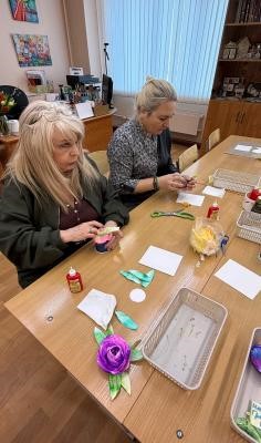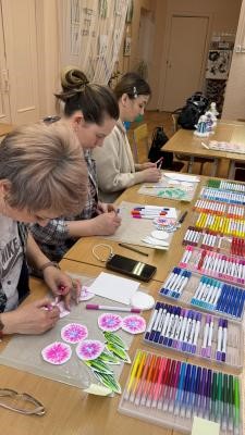 Цветы с акварельным настроением создавали в объединении «Волшебный карандаш». Руководитель мастерской Наталья Александровна Шалимова продемонстрировала коллегам простой и доступный, с экономической точки зрения способ создания ярких творческих продуктов.